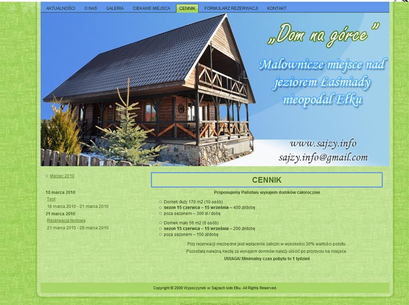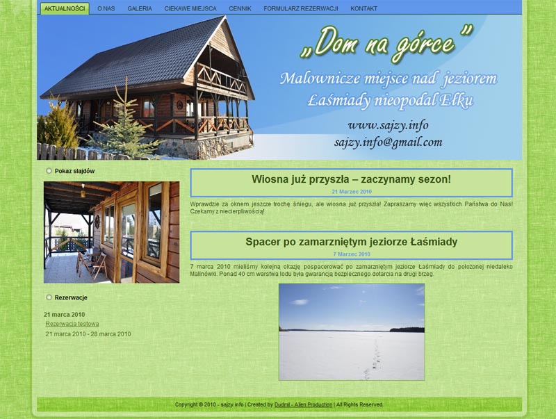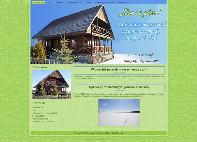 Rozpoczynam prace nad projektem strony agroturystycznej. Witryna umożliwia rezerwację dwóch domków położonych nad malowniczym jeziorem Łaśmiady nieopodal Ełku. www.sajzy.info